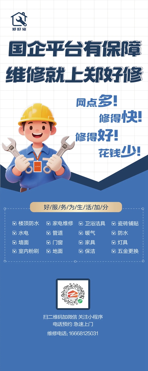 為切實解決群眾房屋維修難題,推動鄭州市維修服務(wù)業(yè)邁向標(biāo)準(zhǔn)化、透明化、便捷化發(fā)展新征程,由鄭州城發(fā)集團(tuán)下屬子公司鄭州城發(fā)安居科技有限公司精心打造的“鄭好修”服務(wù)平臺,正式上線運營。市民通過鄭州安居微信小程序、鄭州安居微信服務(wù)號,即可輕松實現(xiàn)一鍵報修,享受優(yōu)質(zhì)高效的房屋維修服務(wù)。