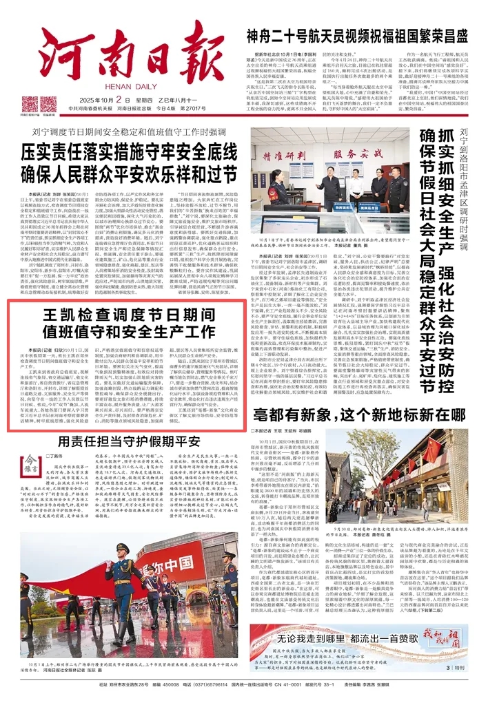 王凱來到省政府總值班室,視頻連線省氣象局、省交通運(yùn)輸廳、省文化和旅游廳、省自然資源廳、省應(yīng)急管理廳和洛陽市、開封市,詳細(xì)了解假期首日道路交通、文旅服務(wù)、安全生產(chǎn)等情況,向堅(jiān)守在一線的工作人員致以節(jié)日問候。他說,今年“雙節(jié)”疊加,人流車流量大,各地各部門要深入學(xué)習(xí)貫徹習(xí)近平總書記在河南考察時(shí)重要講話精神,樹牢底線思維,強(qiáng)化風(fēng)險(xiǎn)意識,嚴(yán)格落實(shí)值班值守和信息報(bào)送等制度,加強(qiáng)會(huì)商研判和協(xié)調(diào)聯(lián)動(dòng),用辛勤付出為人民群眾創(chuàng)造平安祥和的節(jié)日環(huán)境。要密切關(guān)注天氣變化,提高氣象預(yù)報(bào)預(yù)警精準(zhǔn)度,有效應(yīng)對持續(xù)降雨天氣,切實(shí)加強(qiáng)山洪地質(zhì)災(zāi)害防范。要扎實(shí)做好交通運(yùn)輸服務(wù)保障,加強(qiáng)高峰時(shí)段、熱點(diǎn)線路運(yùn)力調(diào)配和管控疏導(dǎo),確保群眾安全便捷出行。要更好激發(fā)文旅市場消費(fèi)潛能,持續(xù)豐富業(yè)態(tài),提升服務(wù)質(zhì)量,讓廣大游客乘興而來、盡興而歸。要嚴(yán)格落實(shí)安全生產(chǎn)責(zé)任制,及時(shí)排查消除危化、礦山、消防等重點(diǎn)領(lǐng)域風(fēng)險(xiǎn)隱患,加強(qiáng)商超、景區(qū)等人員密集場所安全監(jiān)管,維護(hù)人民群眾生命財(cái)產(chǎn)安全。